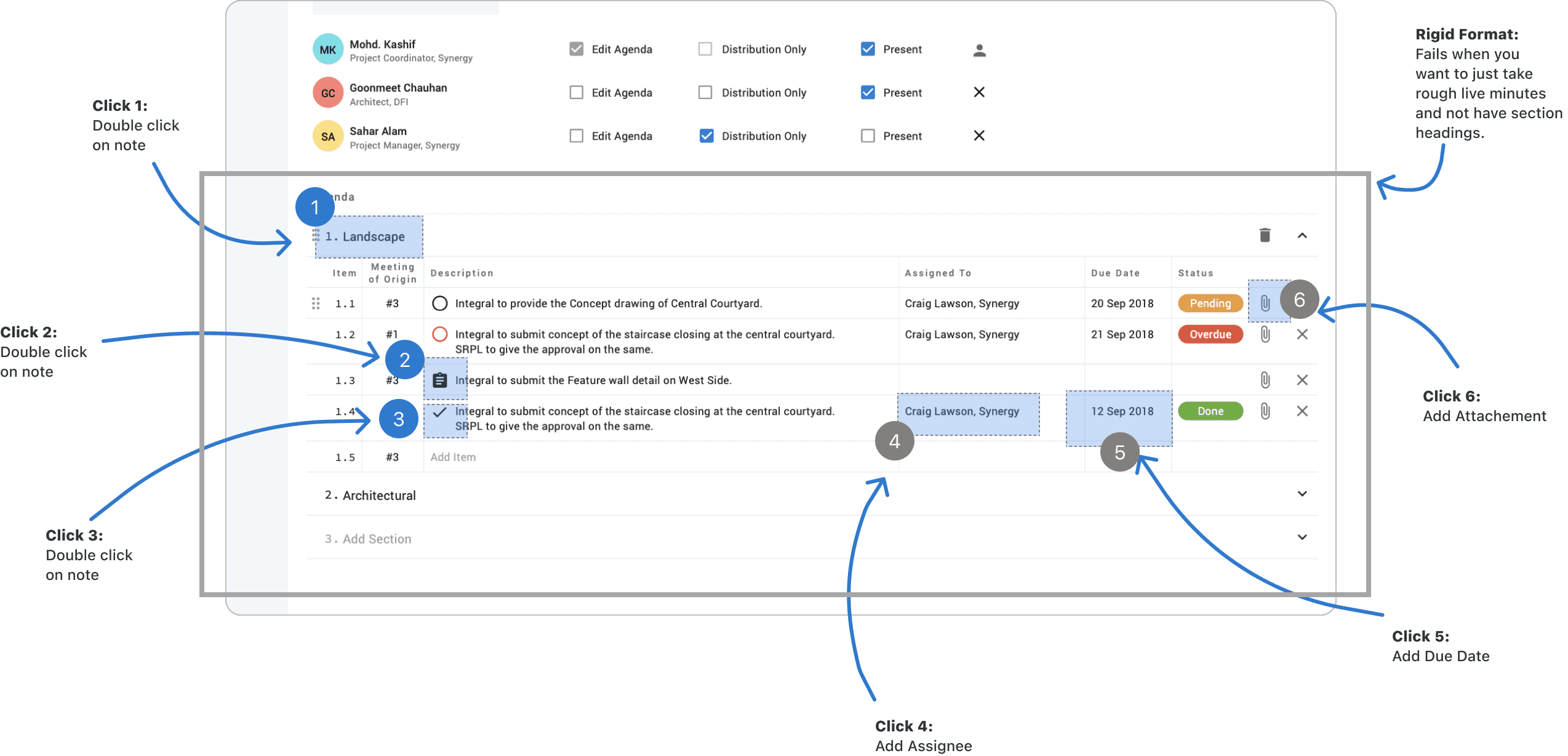 Users wanted more flexibility with the format to comply with their existing meeting templates such as creating sections within sections, bold / underline, reordering line items etc, which were not supported.