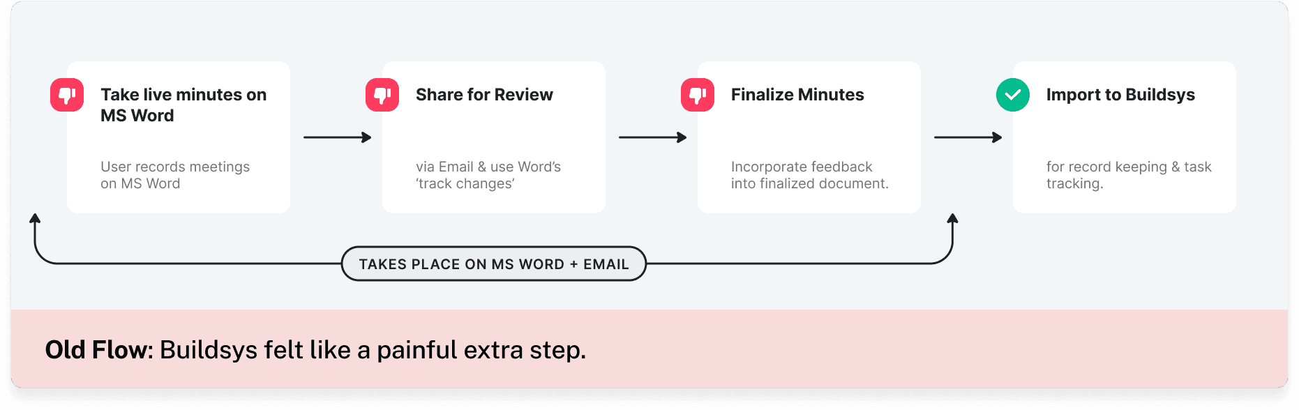 Users were sticking to their old way of taking minutes on MS Word and collecting feedback over email before finalizing the minutes. As a last step, they may or may not import the minutes into Buildsys for record keeping.